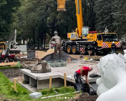 Heute, am Jahrestag des russischen Angriffs auf die Ukraine, hat das Künstlerkollektiv „Aktionsgruppe Vierwärts“ die Fürstenberg-Statue am F-Haus gegenüber dem LWL-Museum für Kunst und Kultur mit Sandsäcken als Zeichen der Solidarität gegenüber der Ukraine und der Erinnerung an den Krieg verkleidet.